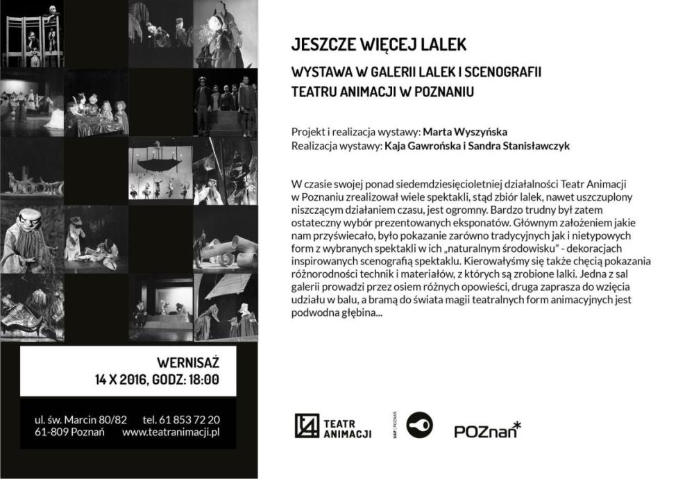 Mimo że jest ich w Teatrze Animacji dość sporo, to w przyteatralnej Galerii Lalek i Scenografii pojawiło się "Jeszcze więcej lalek". Wystawa ukazuje zaledwie niewielki wycinek dziejów Teatru Animacji, ale uzmysławia, jak wielu wybitnych artystów tworzyło na poznańskiej scenie wspaniały, różnorodny, często nowatorski, repertuar dla dzieci oraz dorosłych - pisze Maria Maczuga w portalu kulturapoznan.pl