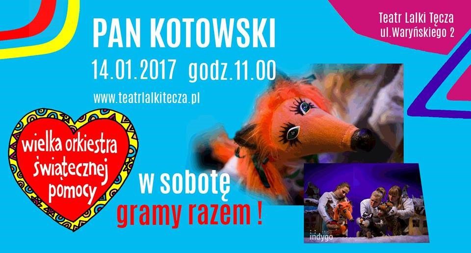 Tęcza w ten weekend Gra z Wielką Orkiestrą Świątecznej Pomocy. 14 stycznia o godz. 11 aktorzy zagrają "Pana Kotowskiego" - historię nobliwego kocura, która zachodzi w głowę, gdzie podziały się jego buty...? A tu przecież zima i śnieg... Po spektaklu licytacje teatralnych lalek i zaproszeń na spektakle.